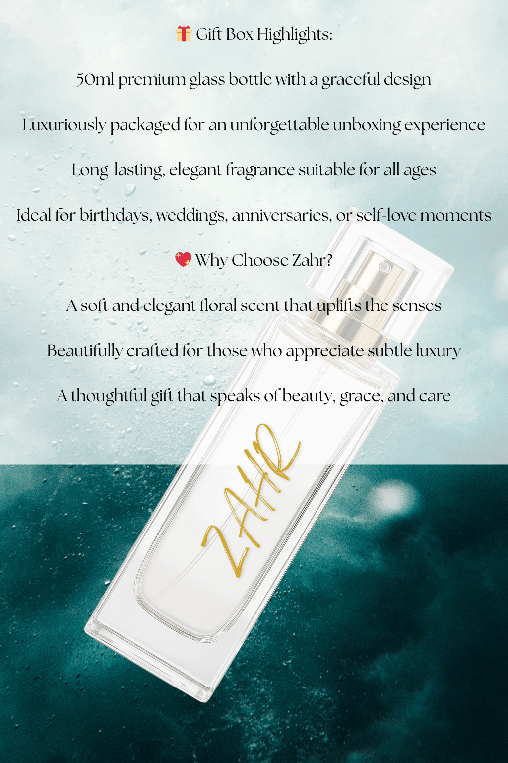 Unveil the beauty of timeless floral elegance with the Zahr Perfume Gift Box, featuring a stunning 50ml bottle of this enchanting fragrance. Named after the Arabic word ¿Zahr¿, meaning ¿flower¿, this scent captures the pure essence of blooming gardens and refined femininity.